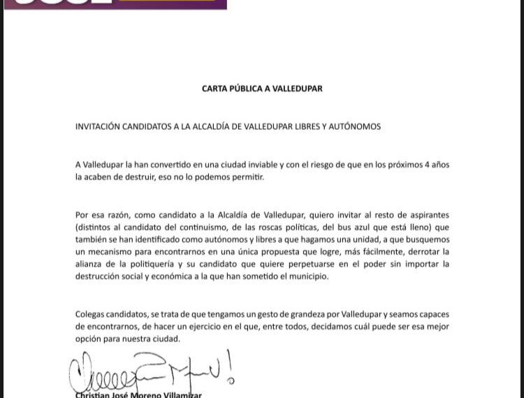 A través de una carta pública, Christian José Moreno, candidato al cargo de alcalde de Valledupar, invitó a los candidatos que también se han identificado como autónomos y libres a hacer una unidad, a buscar un mecanismo para encontrar una única propuesta que logre, más fácilmente, derrotar al candidato del continuismo y de las roscas […]
