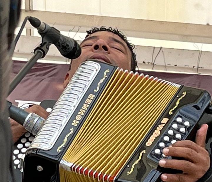Vestidos de amarillo pollito, los seguidores y fanáticos se apostaron en la plaza en pleno mediodía bajo el sol ardiente para apoyar al acordeonero que tocó y cantó alabanzas al Señor en aires de puya, paseo, merengue y son, arrancando los aplausos de un público enardecido.